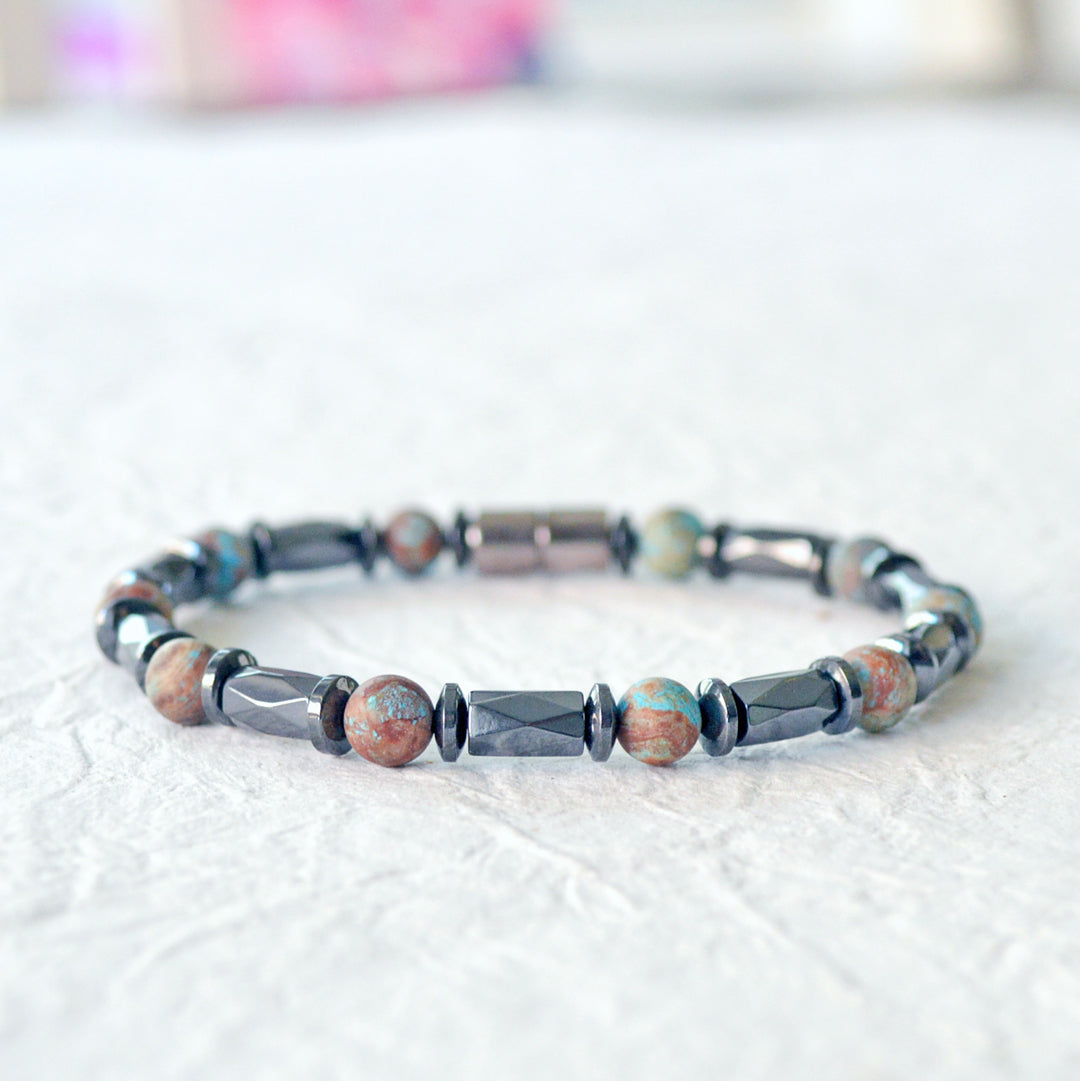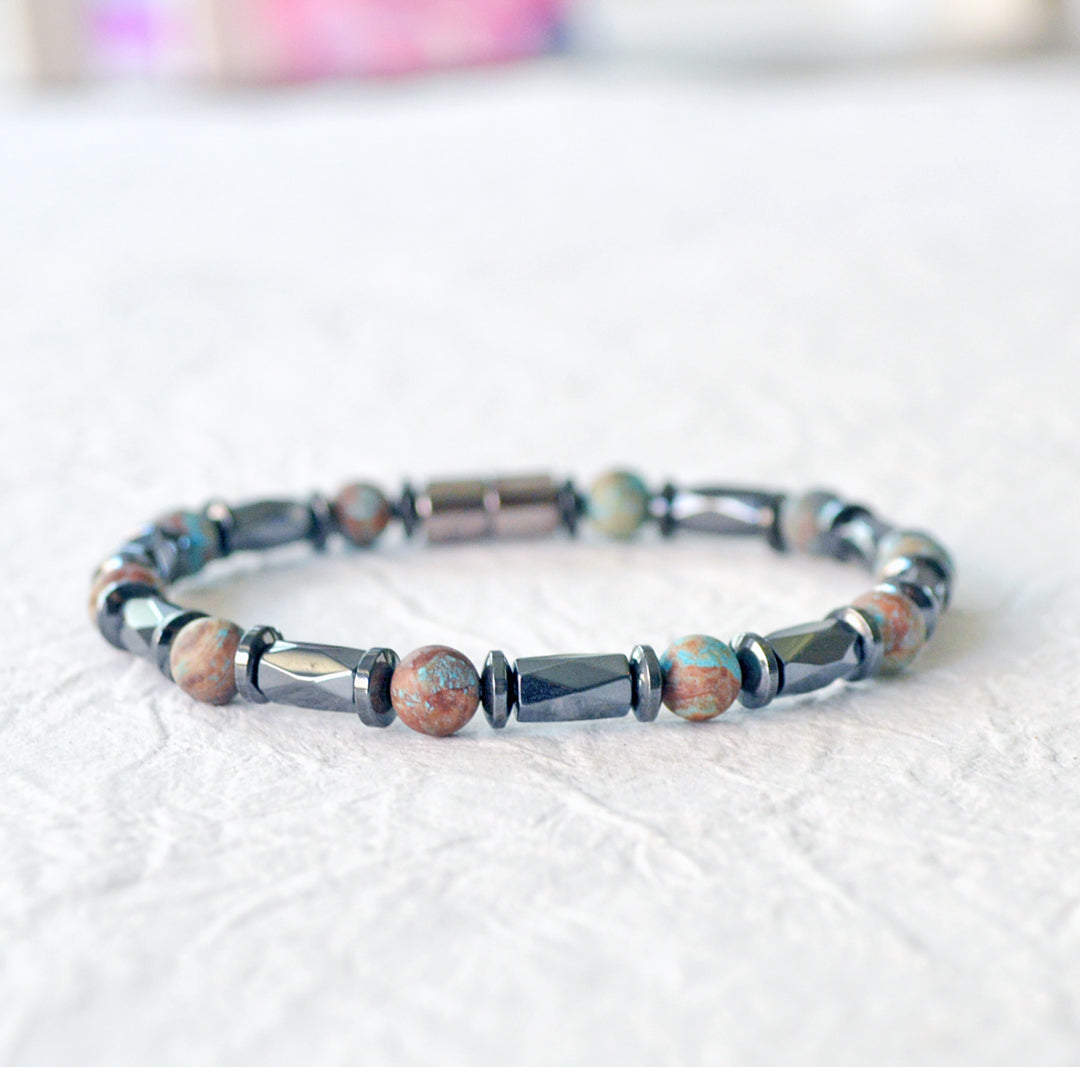 You'll love the blend of design and natural pain relief with this Magnetic Bracelet. Handcrafted in the USA with black hematite magnetic beads and blue lace agate gemstone beads, this bracelet combines style with the proven benefits of magnetic therapy, offering an effective way to ease pain and boost energy while enhancing your personal style.